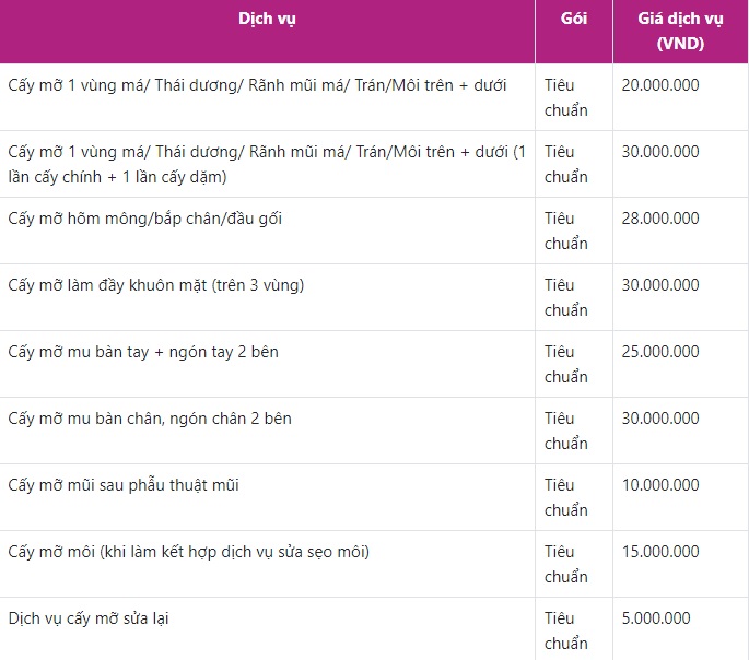 Chi phí cấy mỡ tự thân tại các bệnh viện, cơ sở thẩm mỹ uy tín giao động từ 16.000.000 – 75.000.000 đồng. Tại Thẩm mỹ Bệnh viện Hồng Hà, giá cấy mỡ tự thân giao động từ 10.000.000 – 30.000.000 đồng.