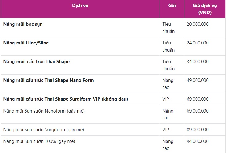 5. Nâng mũi L-line giá bao nhiêu tiền – Bảng giá nâng mũi L Line