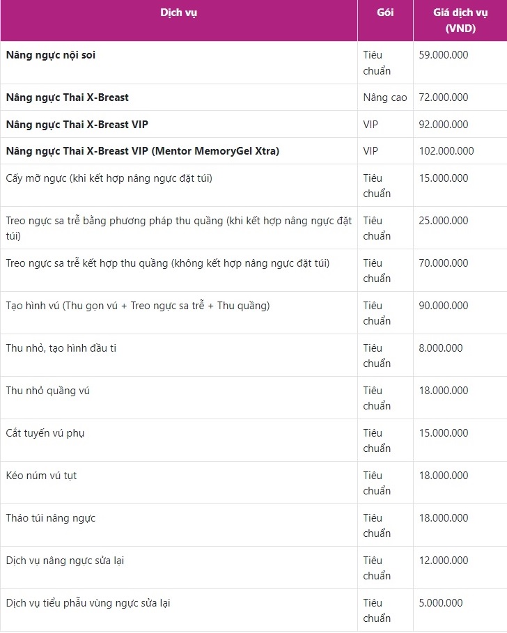 Bên cạnh đó, dành cho những chị em băn khoăn phẫu thuật vòng 1 bao nhiêu tiền chi phí nâng ngực tại Thẩm mỹ Bệnh viện Hồng Hà là khoảng 59.000.000 – 102.000.000 đồng. Tùy theo từng dịch vụ mà giá thành áp dụng cũng khác nhau. Cụ thể:
